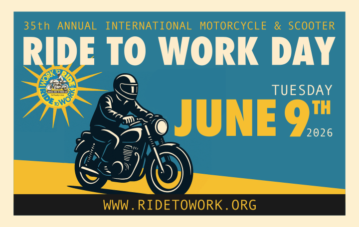Show the world that motorcycles and scooters are great for everyday transportation! On Ride to Work Day, ride your motorcycle or scooter to commute, shop/run errands, or simply to enjoy the experience.